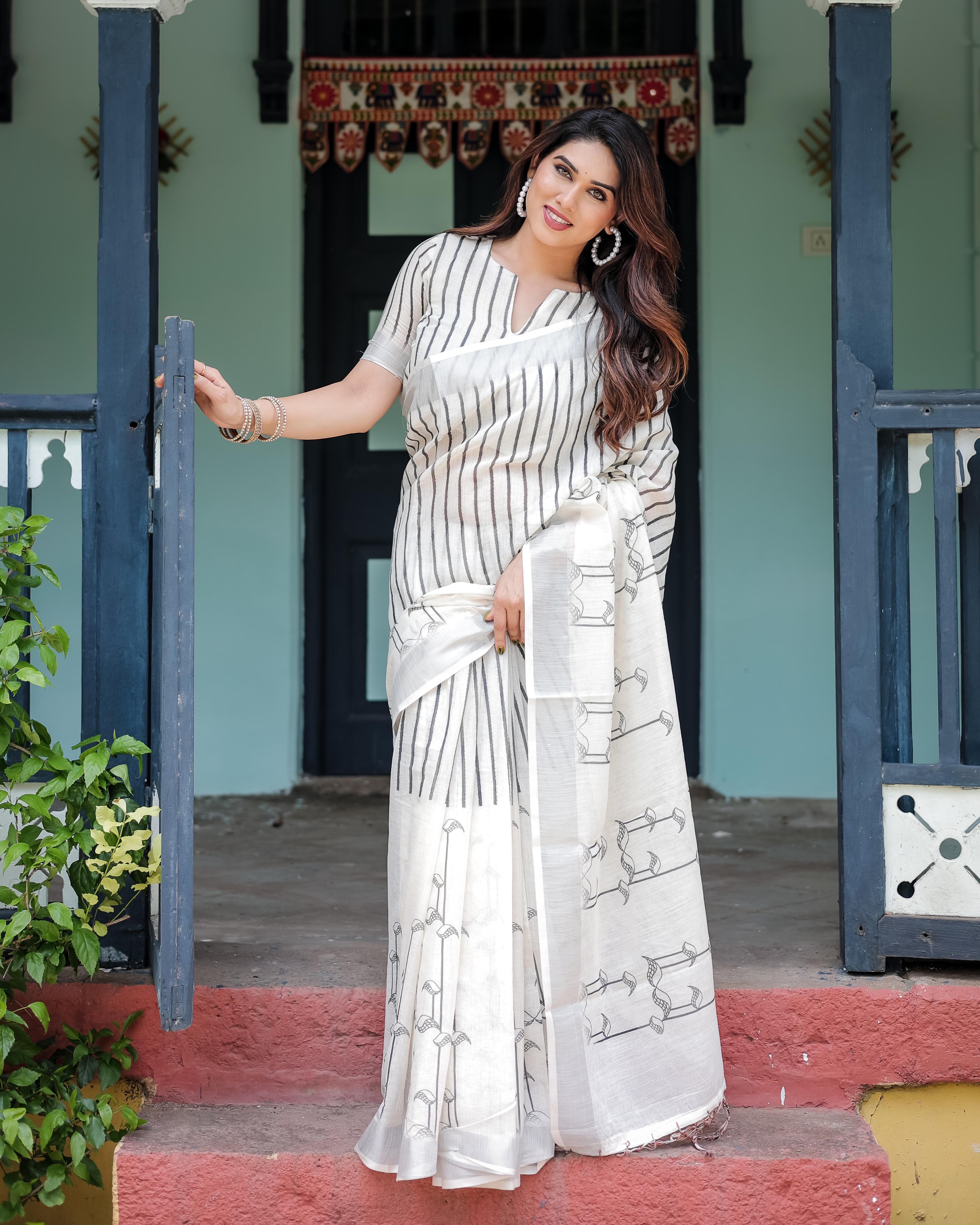 Radiate timeless elegance with this white linen cotton saree, featuring sleek vertical black stripes and subtle arrow motifs on the pleats and pallu. The lightweight fabric drapes effortlessly, offering both comfort and sophistication—ideal for daytime events, office wear, or cultural gatherings.