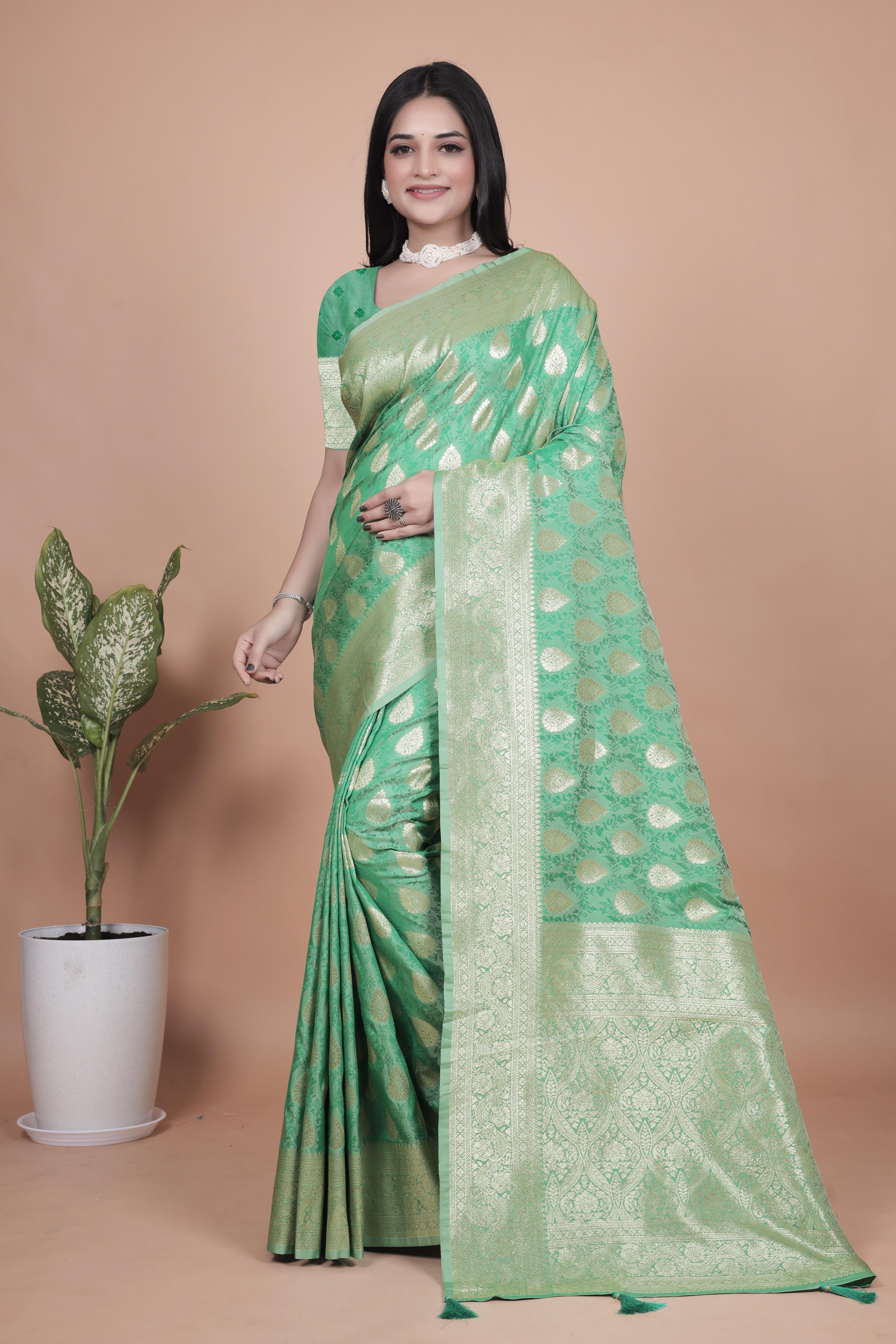 Step into elegance with this refreshing emerald green Banarasi silk saree, graced with glimmering golden zari work. Its vibrant hue combined with intricate weaving patterns makes it a stunning piece for any festive or ceremonial occasion. The saree showcases all-over traditional gold butti motifs in teardrop and floral shapes, enclosed within fine vine work. The wide border and grand pallu are woven with classic Banarasi craftsmanship, enhancing its rich traditional charm. The soft yet lustrous silk drapes beautifully, offering both grace and comfort. Specifications: Color: Emerald Green with Golden Zari Fabric: Luxurious Banarasi Silk Work: Woven Zari Butti with Ornate Pallu and Border Pallu: Heritage design with intricate zari craftsmanship Occasion: Perfect for Weddings, Puja Events, Receptions, and Festivals Saree Length: 5.5 meters | Blouse Piece: 0.8 meter unstitched (matching green with zari work) Care Instructions: Dry clean only. Store folded in a muslin cloth.