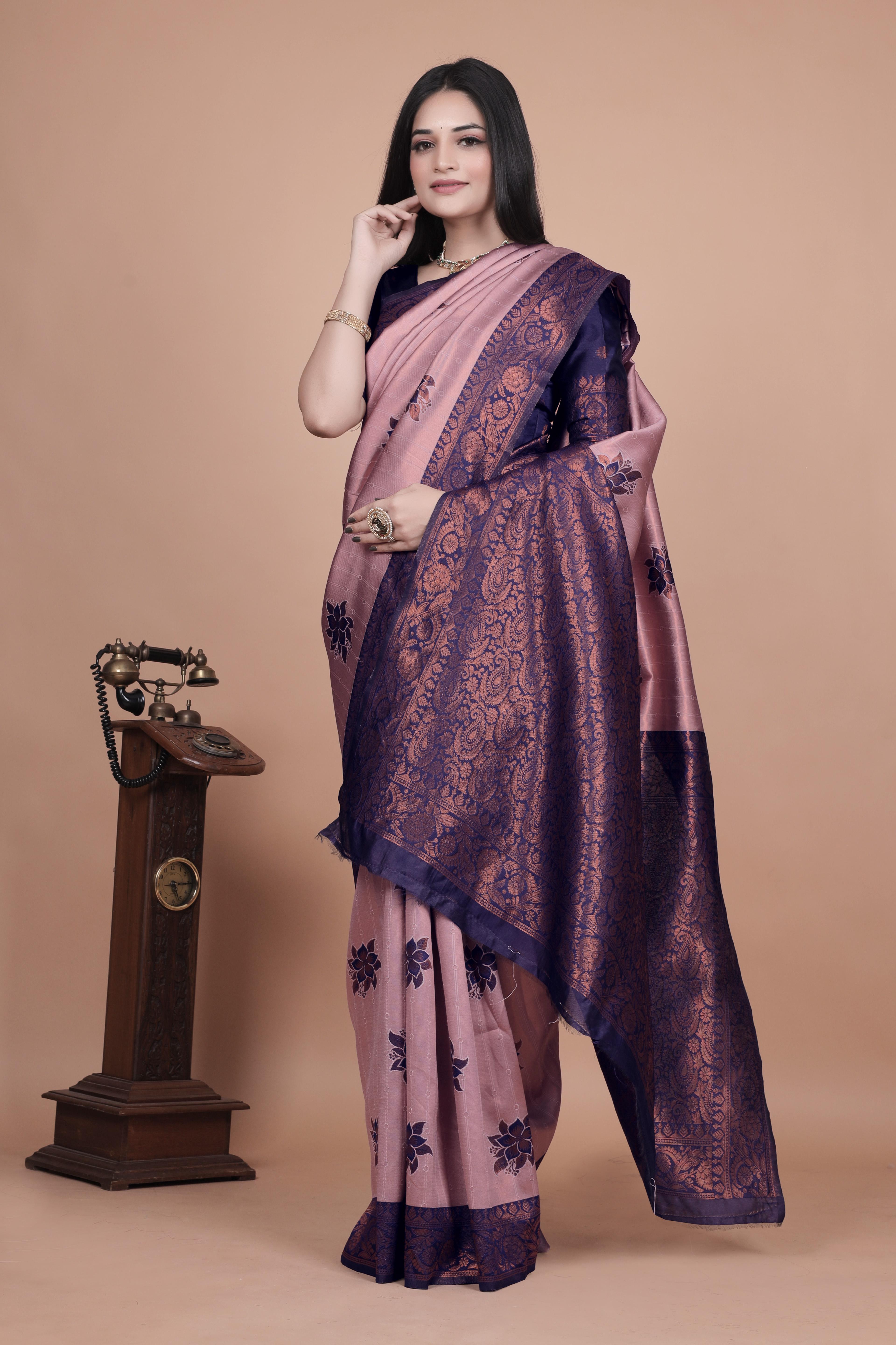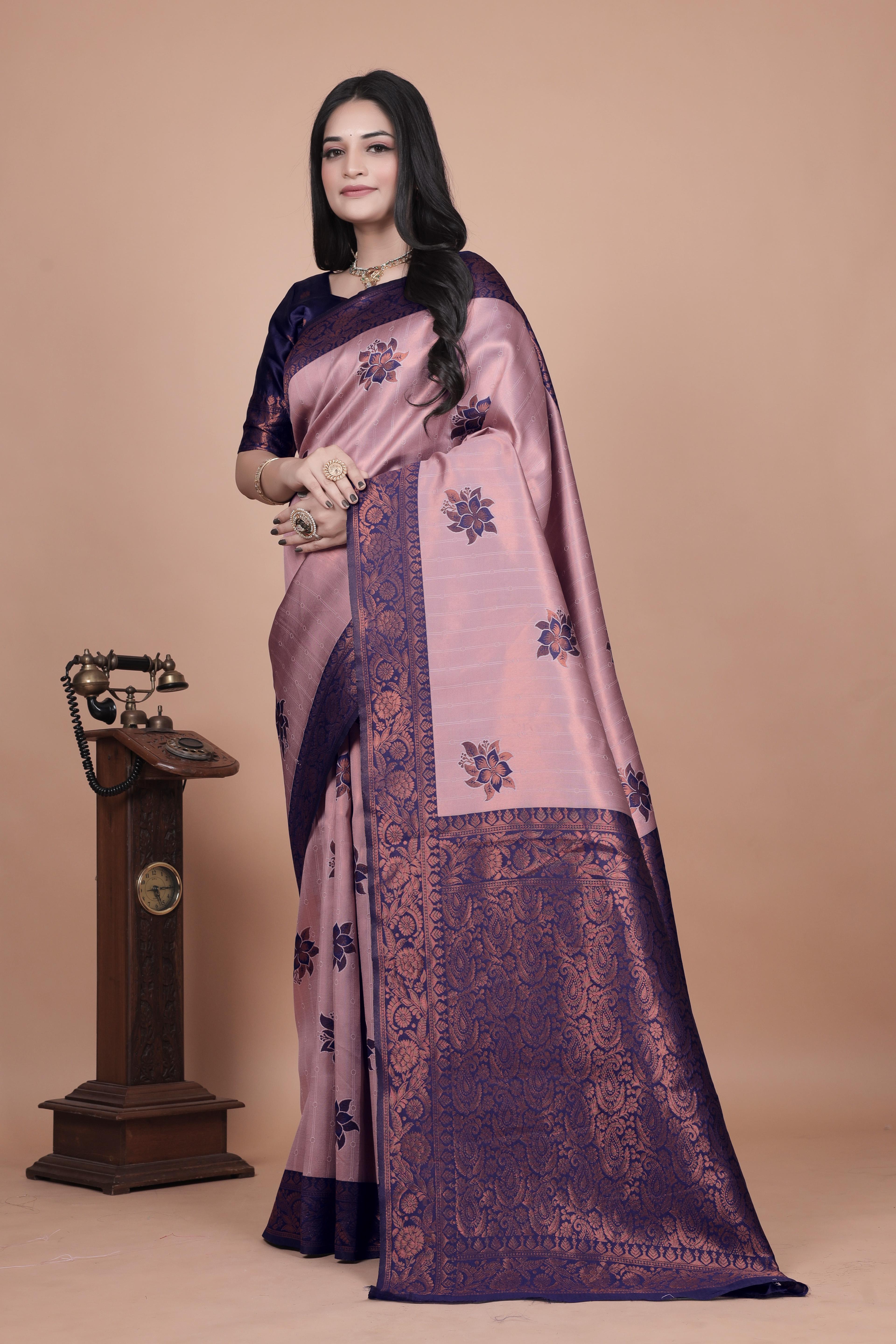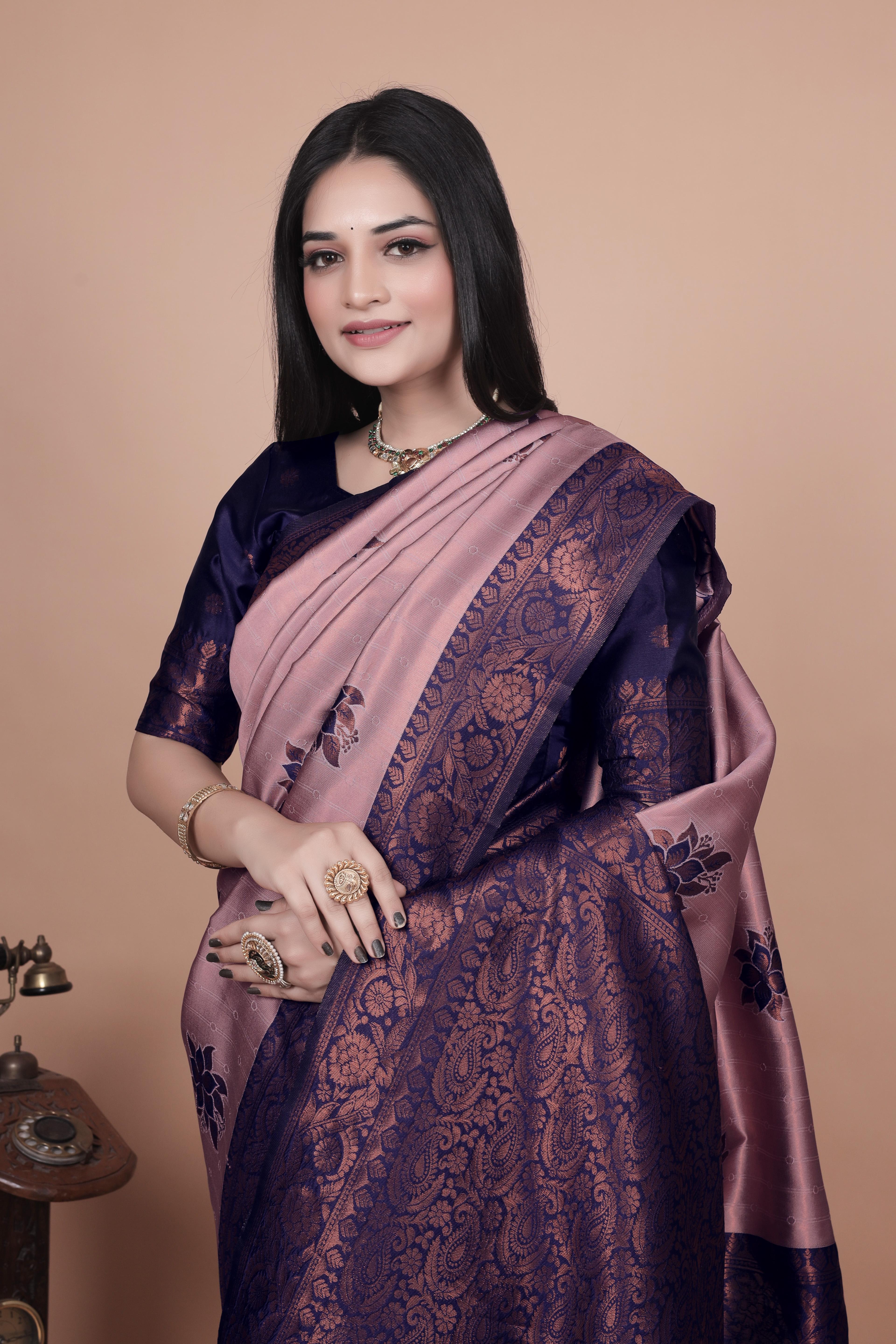 Step into elegance with this captivating mauve Banarasi silk saree adorned with exquisite navy-blue lotus motifs