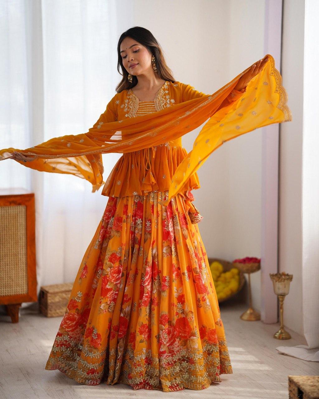 Mustard Yellow Floral Printed Lehenga Set