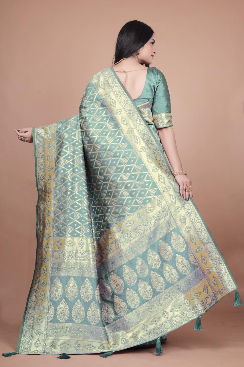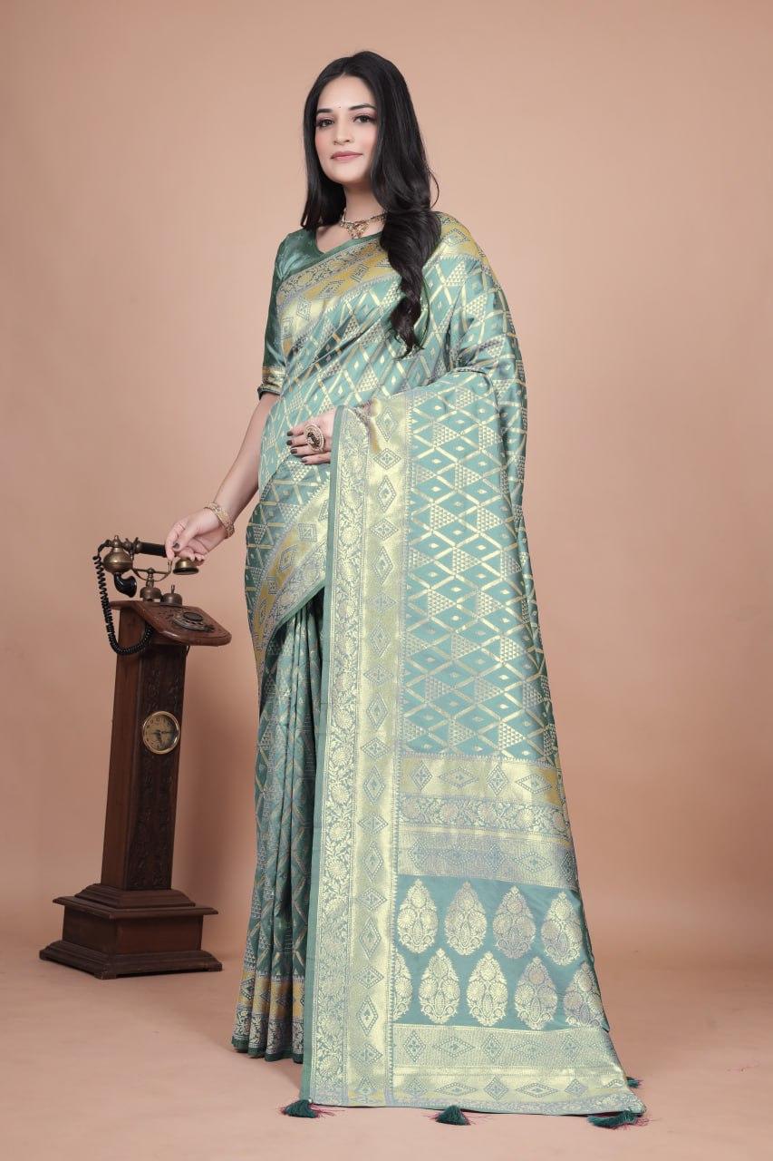 Elevate your ethnic wardrobe with this mesmerizing pastel green Banarasi silk saree, designed to exude timeless charm and modern elegance. This exquisite piece features intricate golden zari work with geometric diamond patterns across the body, beautifully contrasted by majestic floral motifs on the pallu and border.