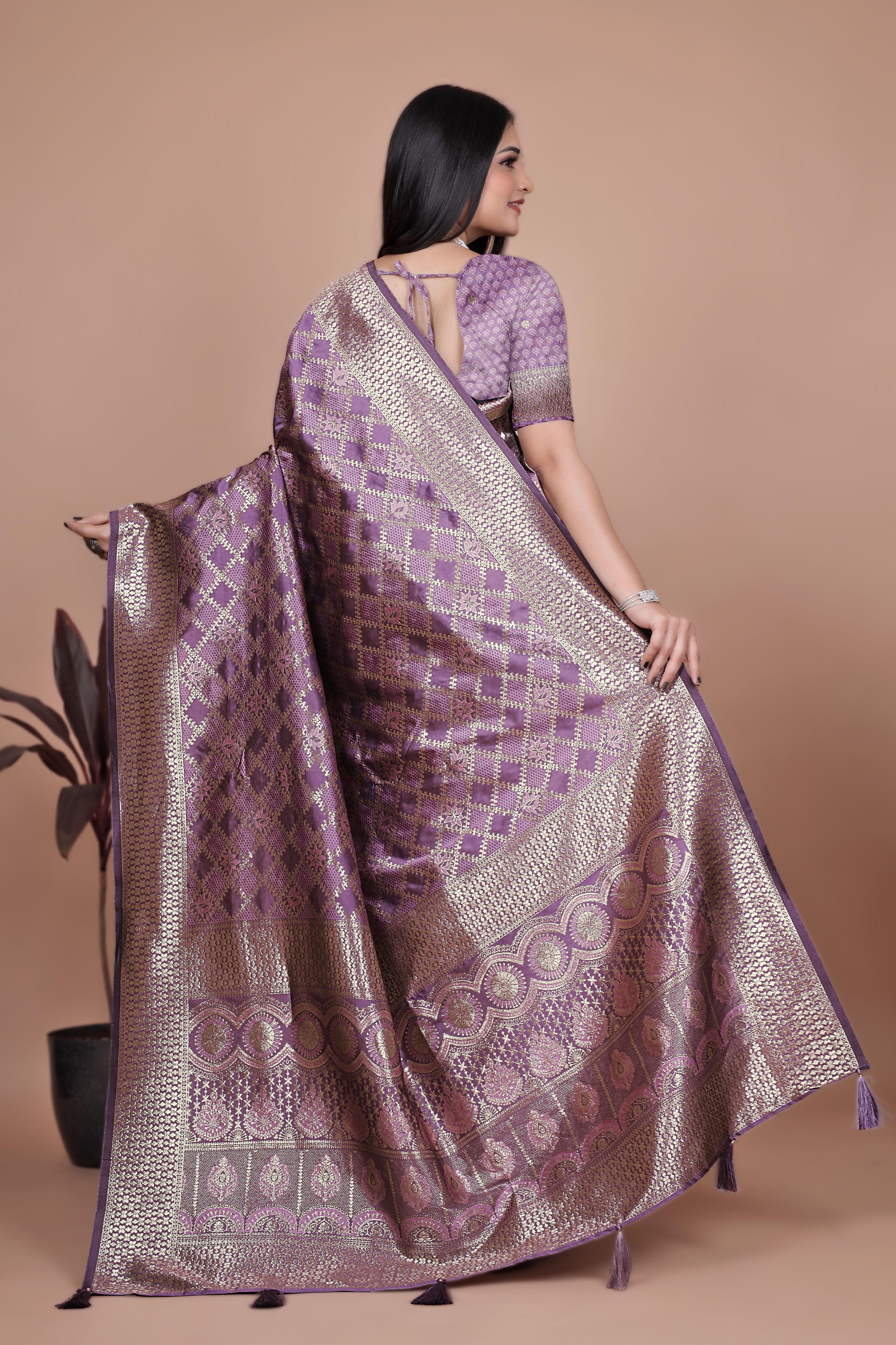 Step into elegance with this majestic royal purple Banarasi silk saree, intricately woven with shimmering golden zari motifs. The rich texture and detailed craftsmanship create a beautiful blend of traditional patterns across the drape and pallu. The broad ornate border and luxurious finish make it a perfect pick for weddings, festive celebrations, and grand occasions. It comes with a matching unstitched blouse piece to complete the graceful ensemble.Fabric: Premium Banarasi SilkColor: Royal Purple with Golden Zari WeavingDesign: Intricate All-over Weaving, Rich Pallu, Ornate BorderSaree Length: 5.5 meters | Blouse Piece:0.80 meterOccasion: Wedding, Festive, Party Wear, Traditional GatheringsCare: Dry Clean Recommended