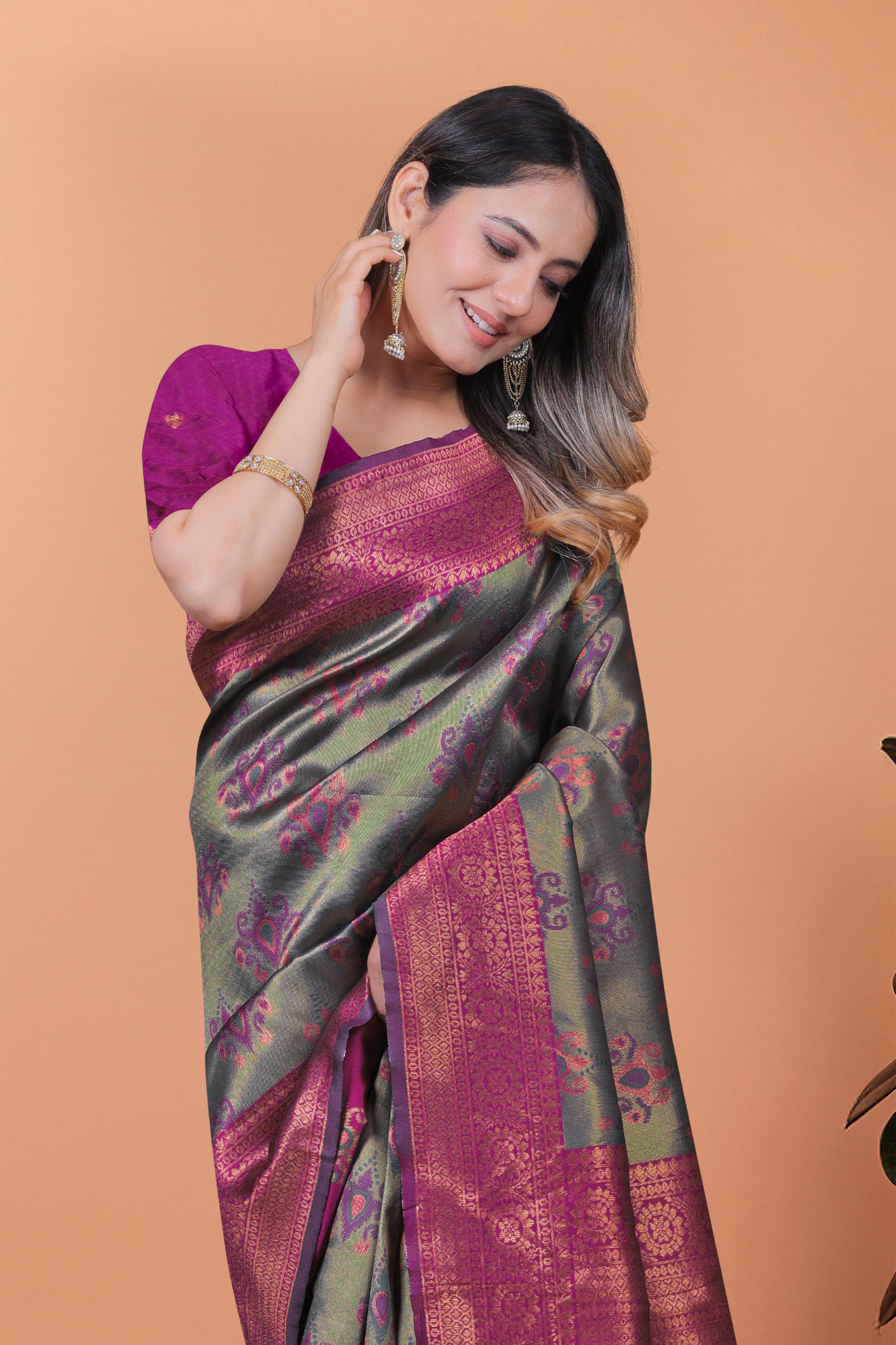 Step into elegance with the Royal Radiance Banarasi Silk Saree, a luxurious blend of deep olive green and vibrant magenta hues, woven to perfection. Adorned with floral motifs, diagonal zari patterns, and an exquisitely detailed magenta-gold pallu, this saree is designed to make a statement at every traditional occasion. With its rich Banarasi weave and radiant color play, itβs a must-have for weddings, festive events, and ceremonial gatherings. ![]()