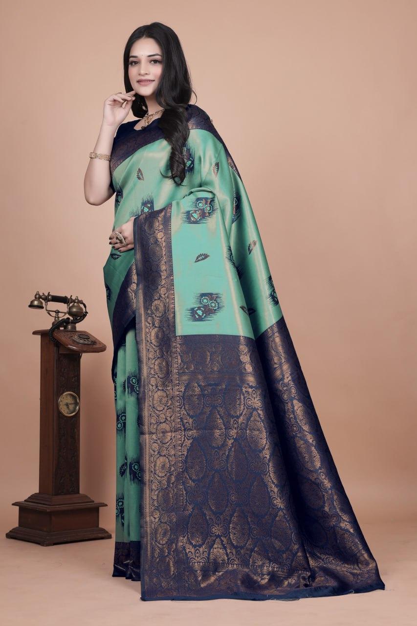 Elevate your traditional wardrobe with this elegant sea green Banarasi silk saree, accentuated with a rich navy blue border and pallu intricately woven in gold zari. The body of the saree features tasteful floral buta motifs in multicolor threads, giving it a vibrant yet graceful appeal.