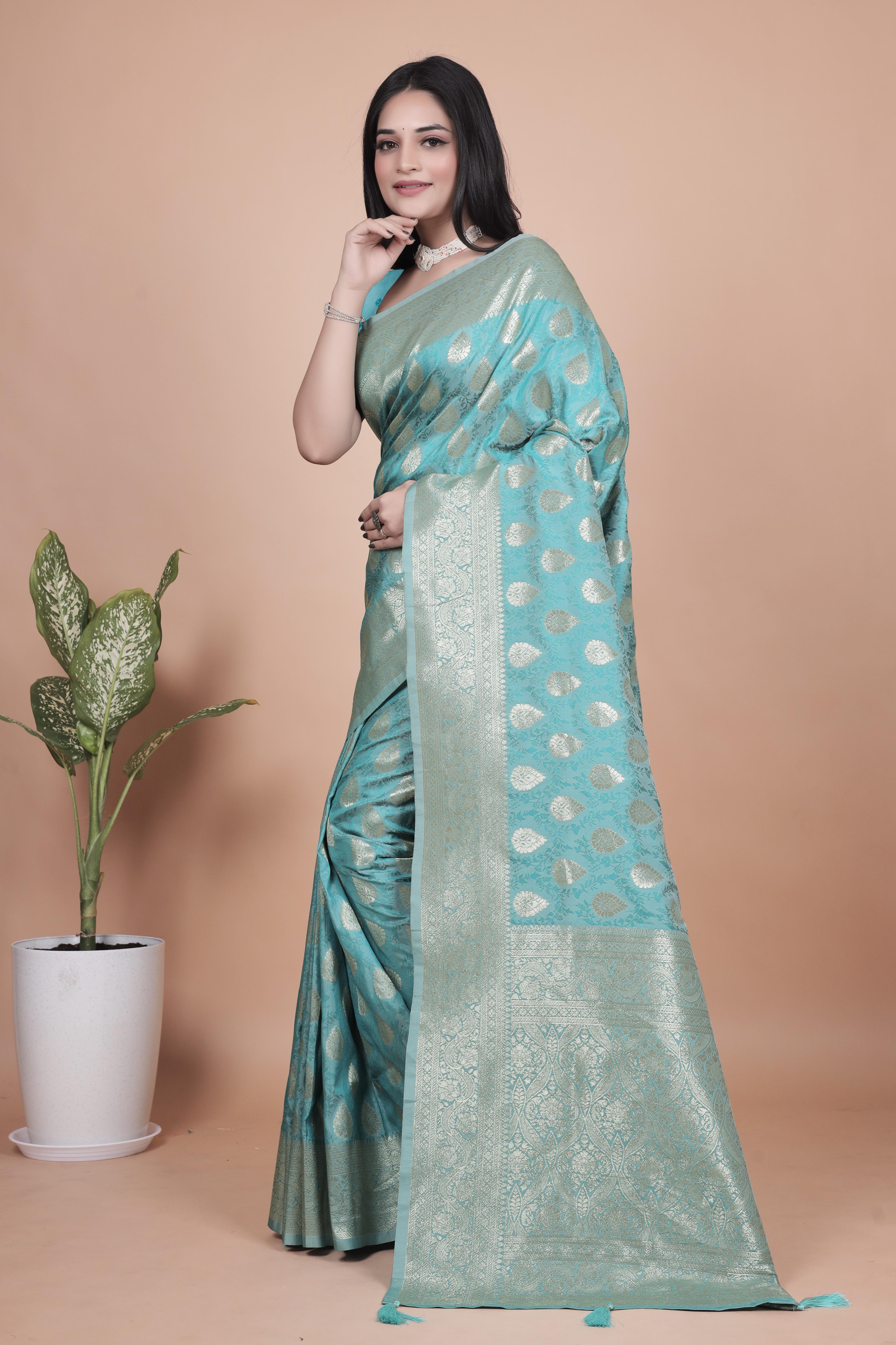 Refresh your ethnic wardrobe with this stunning sky blue Banarasi silk saree, exquisitely woven with shimmering silver zari. This piece reflects elegance and calm sophistication, ideal for both daytime celebrations and evening occasions. The saree features traditional butti motifs scattered all over, highlighted by a finely detailed silver zari border and a grand pallu adorned with floral and geometric Banarasi patterns. The soft silk fabric ensures graceful draping, while the cool blue tone makes it a flattering choice for all skin tones. Specifications: Color: Sky Blue with Silver Zari Fabric: Banarasi Silk Work: Woven Silver Zari Butti with Rich Border & Pallu Pallu: Detailed with traditional Banarasi motifs Occasion: Suitable for Festivals, Engagements, Parties, and Cultural Events Saree Length: 5.5 meters | Blouse Piece: 0.8 meter (unstitched, in matching fabric) Care Instructions: Dry clean only. Store in a cool, dry place wrapped in muslin
