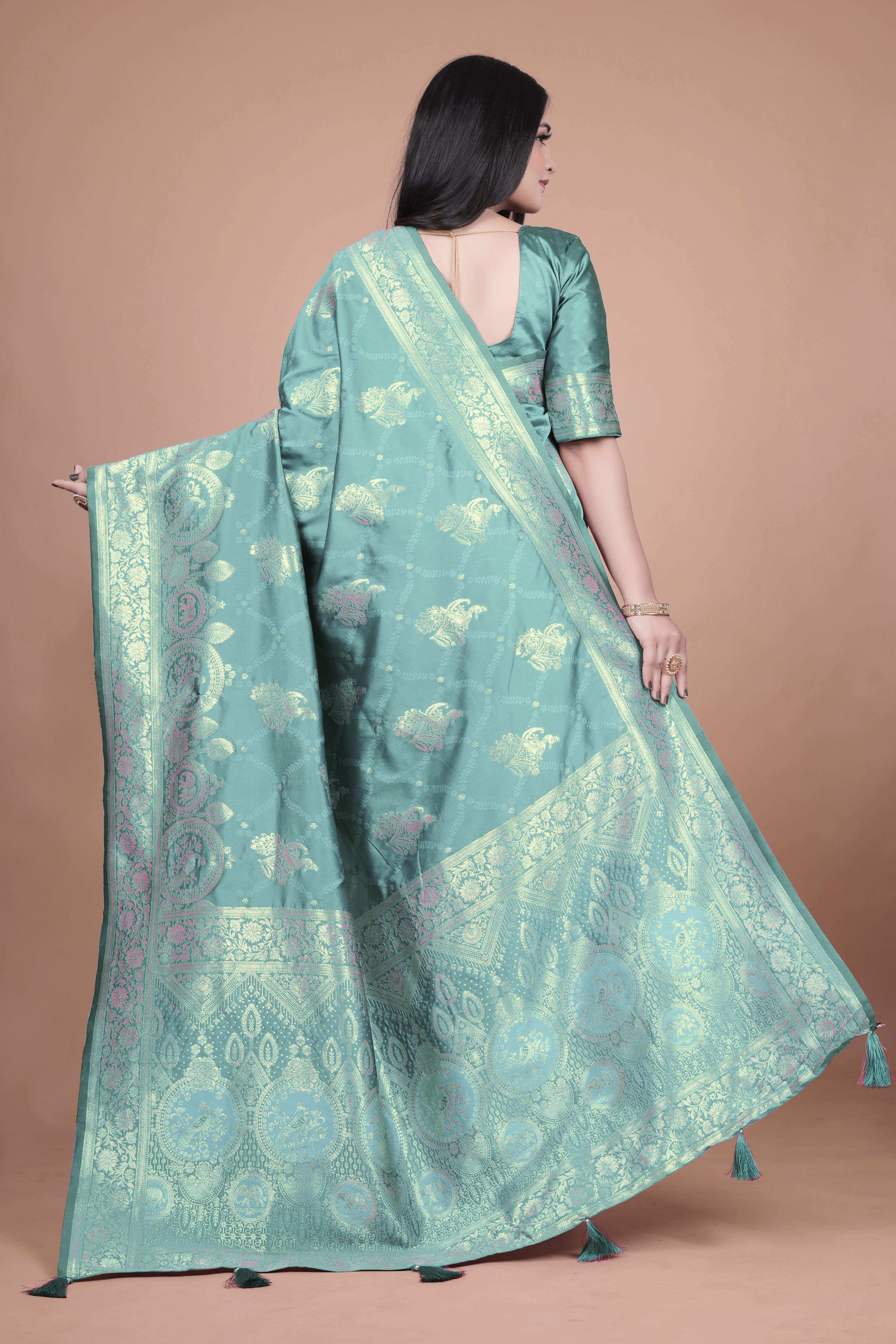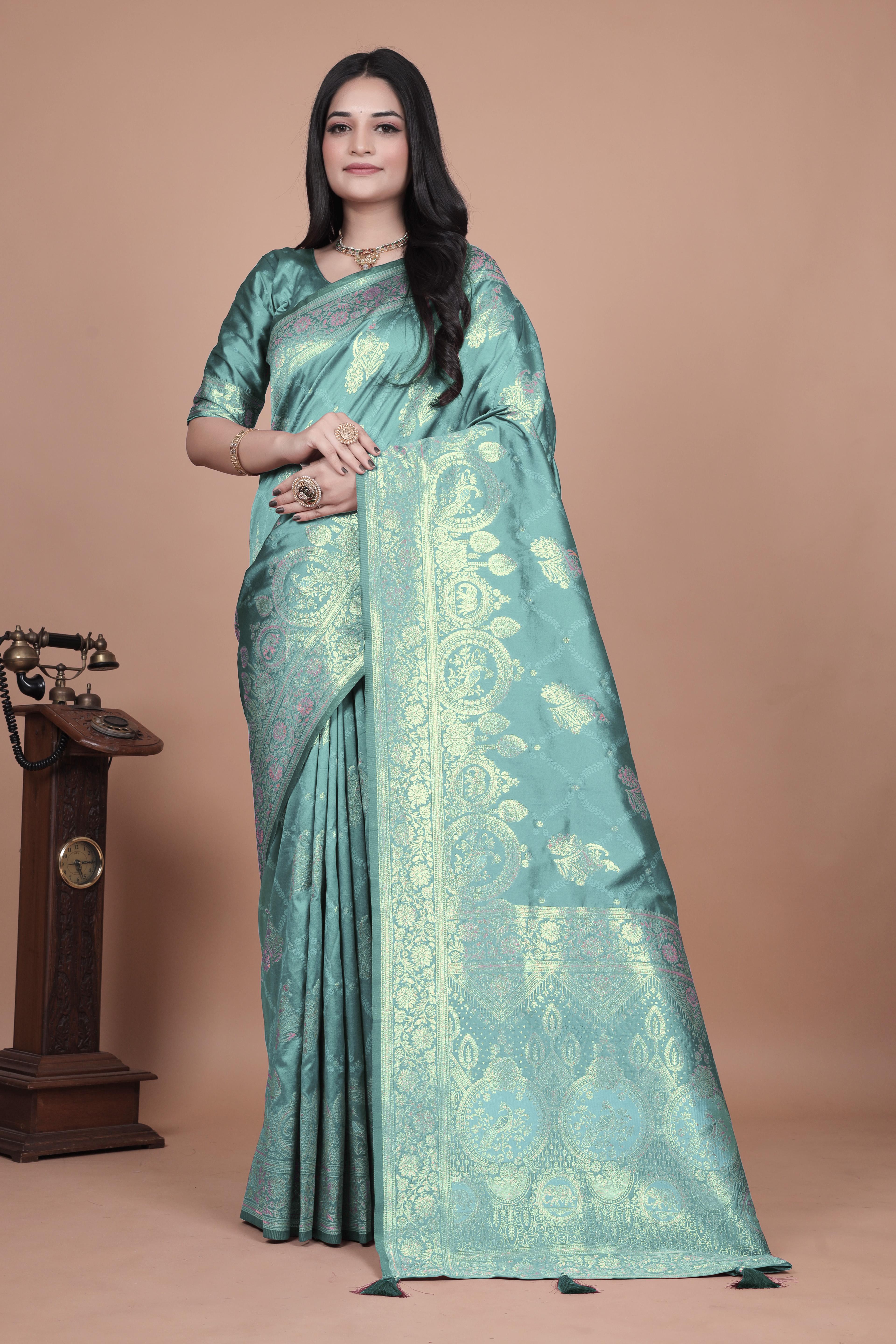 Embrace classic grandeur with this teal Banarasi silk saree, adorned with rich golden zari weaving that gleams with every step. Crafted in luxurious silk, this saree offers a graceful drape, perfect for weddings, festive gatherings, and traditional celebrations. The saree’s body features intricate floral and peacock-inspired motifs, woven seamlessly in gold zari, reflecting the elegance of Indian textile heritage. A richly decorated pallu and broad border complete the regal look, while the refreshing teal tone brings a modern edge to this timeless piece. Specifications: Color: Teal with Golden Zari Fabric: Premium Banarasi Silk Work: Woven zari motifs with ornamental border Pallu: Heavily detailed golden zari pallu with traditional designs Occasion: Ideal for Weddings, Festive Events, Traditional Ceremonies Saree Length: 5.5 meters | Blouse Piece: 0.8 meter unstitched Care Instructions: Dry clean only. Store in a soft muslin cloth to maintain luster and texture.