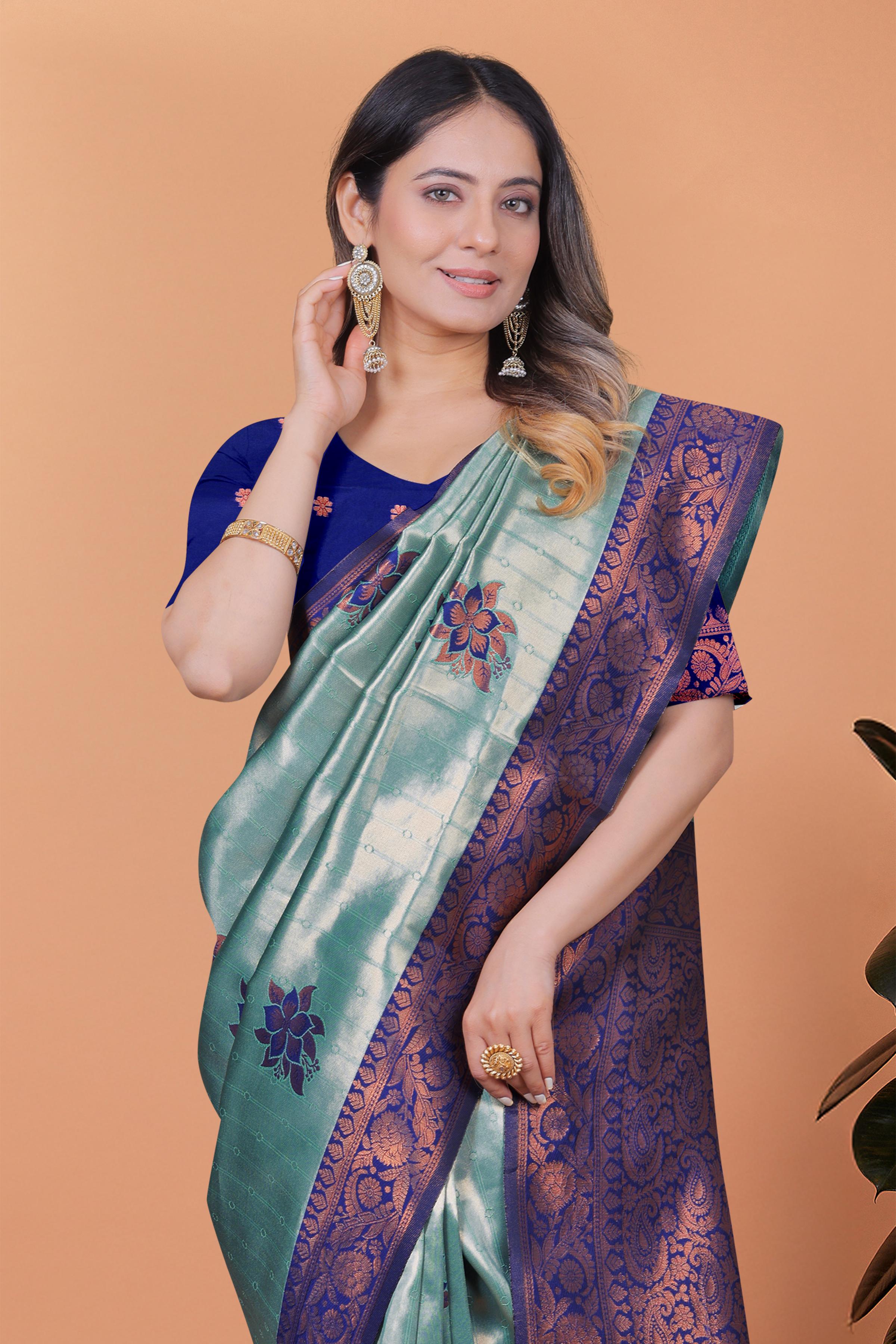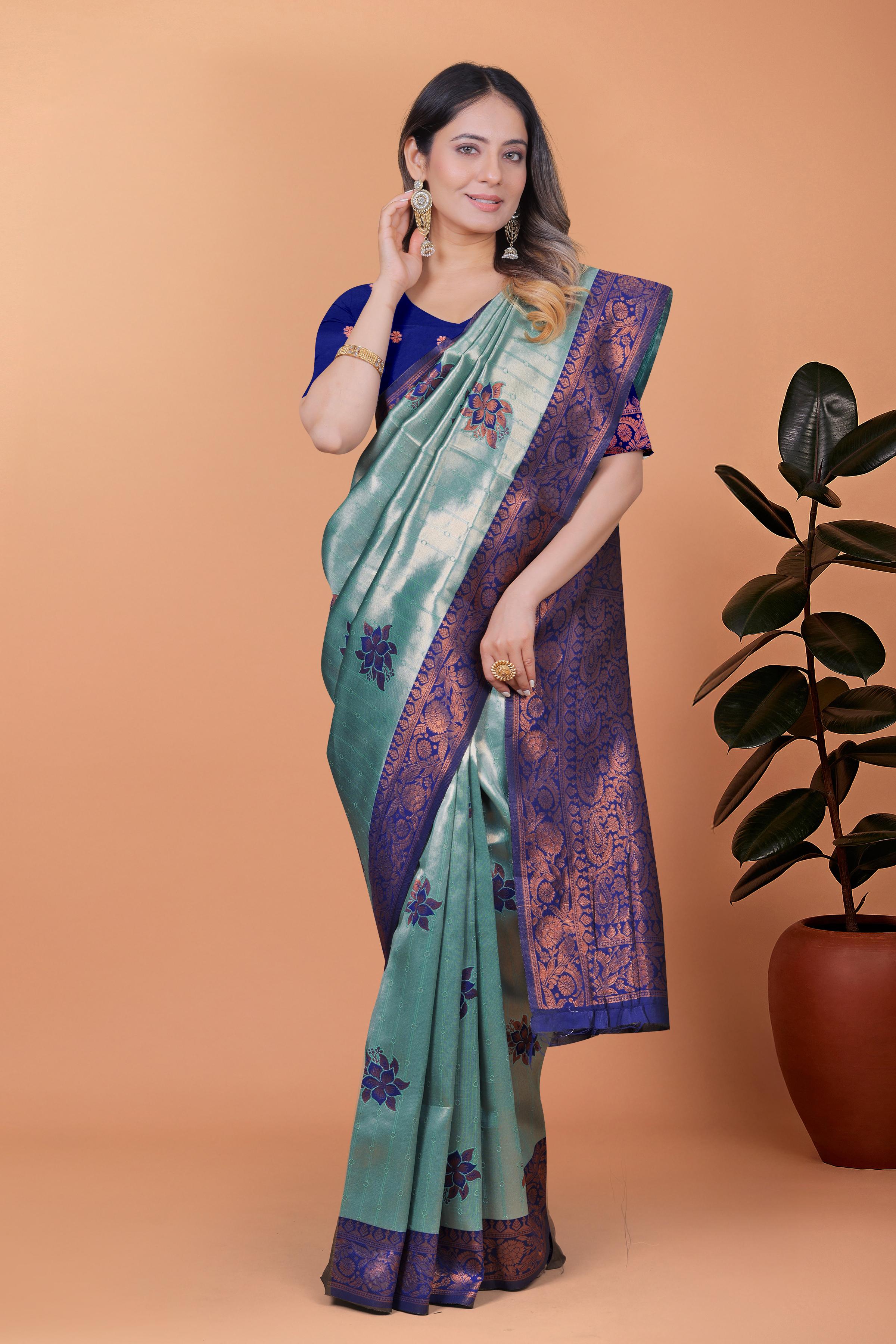 Grace meets grandeur in the Celestial Grace Banarasi Silk Saree, a captivating piece in a serene mint green base complemented by deep royal blue borders and floral motifs. The intricate copper zari work on the pallu and blouse adds an element of timeless tradition, making it perfect for weddings, receptions, or festive soirรฉes ![]()