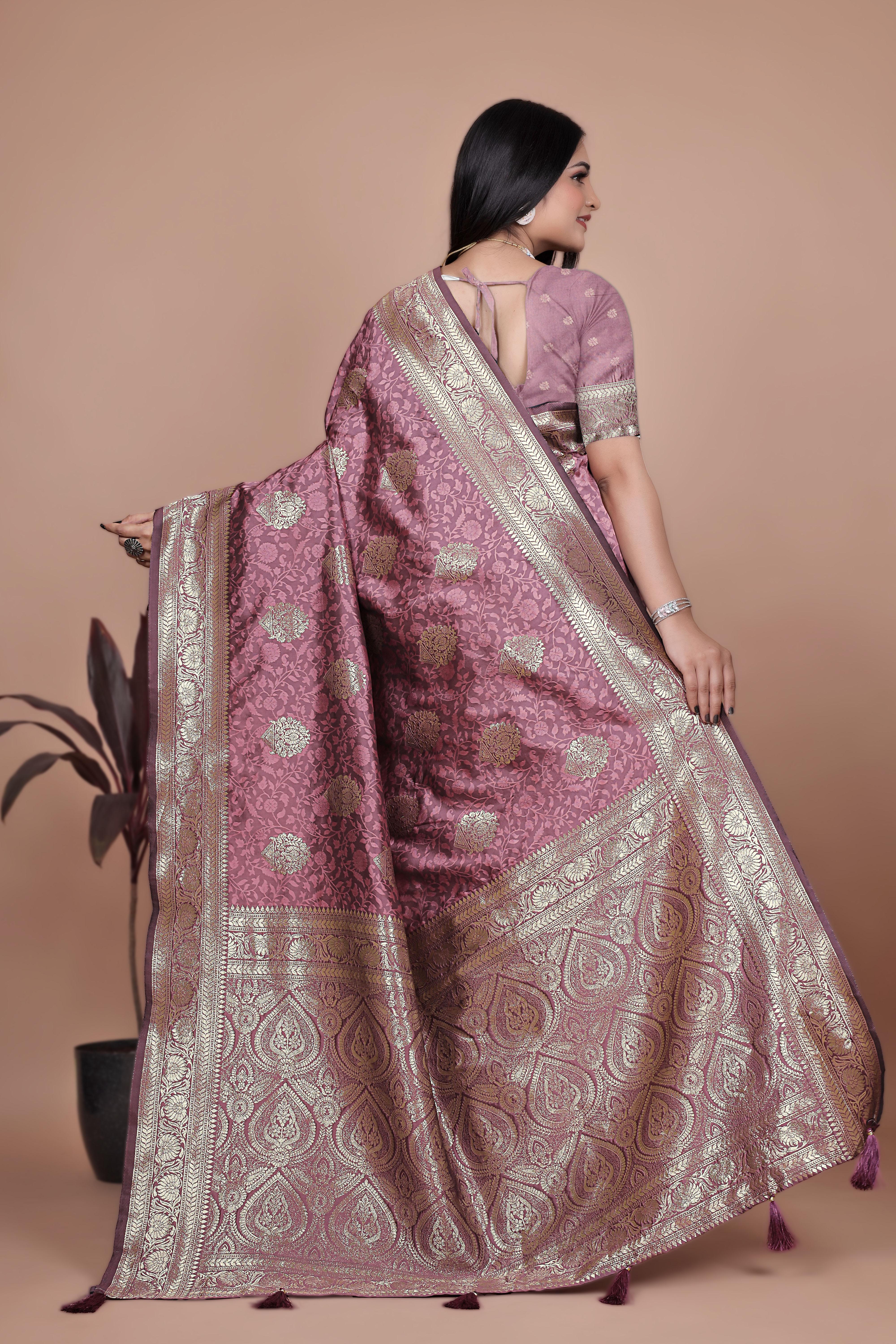 Embrace sophistication in this dusty rose Banarasi silk saree, lavishly woven with glimmering gold zari