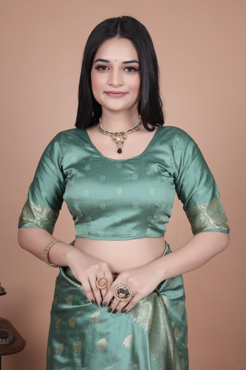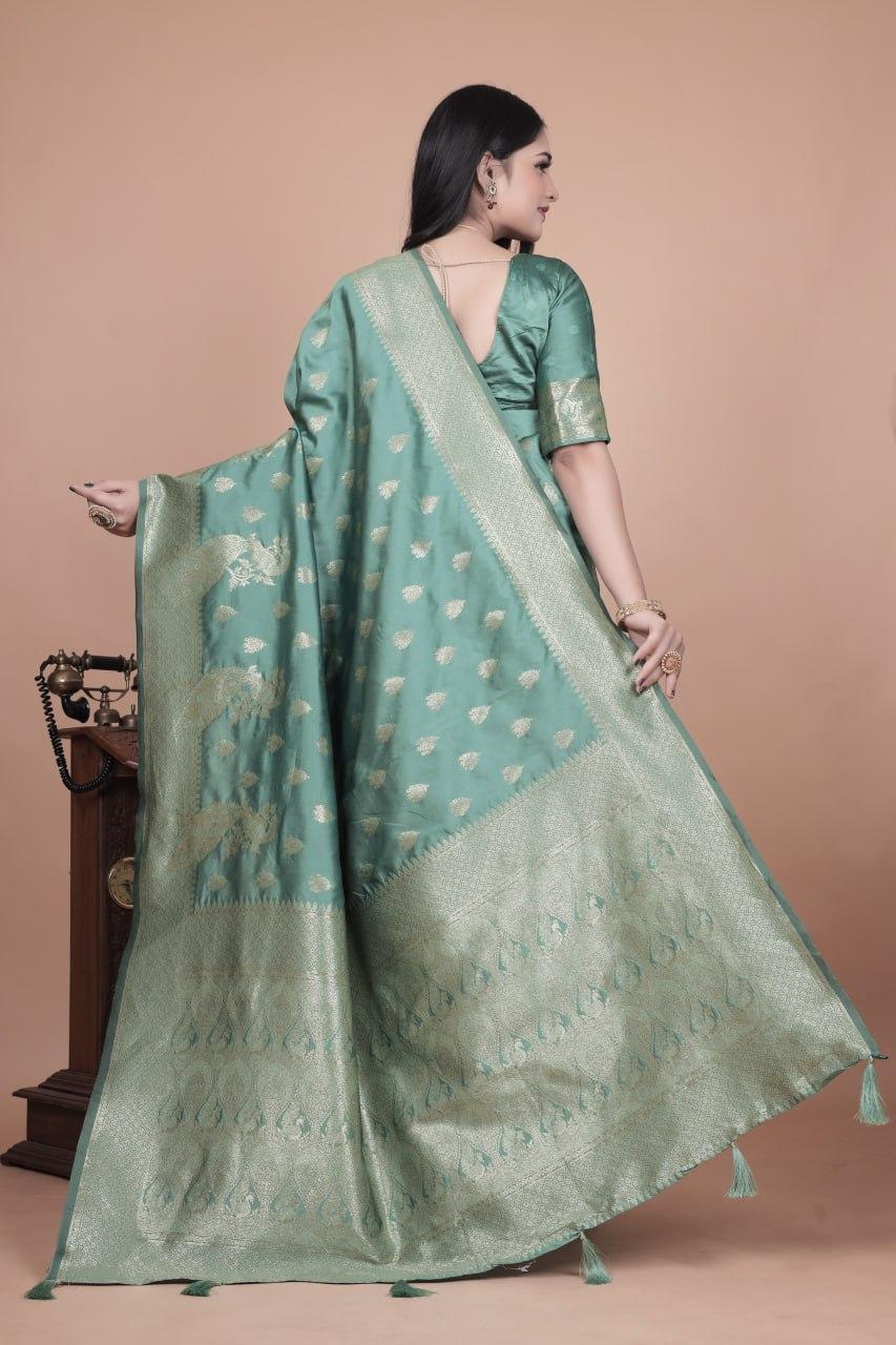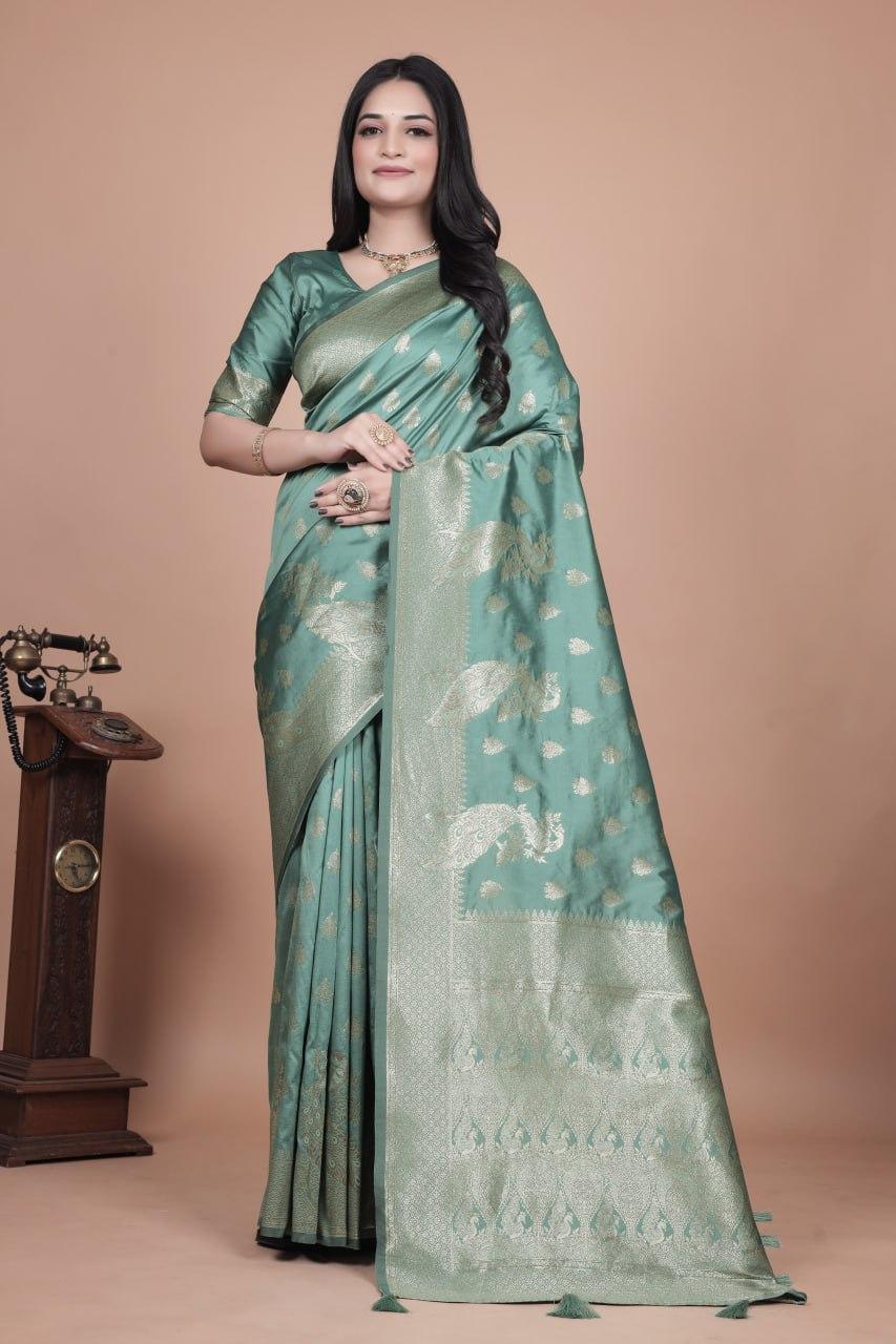 Drape yourself in timeless elegance with this luxurious mint green Banarasi silk saree, adorned with intricate golden zari motifs. Featuring regal peacock patterns woven delicately throughout the body, this saree exudes grace and sophistication. The richly crafted pallu showcases exquisite traditional detailing, while the subtle sheen of silk adds a touch of grandeur. Paired with a matching blouse piece, this saree is perfect for weddings, festive occasions, and cultural celebrations.