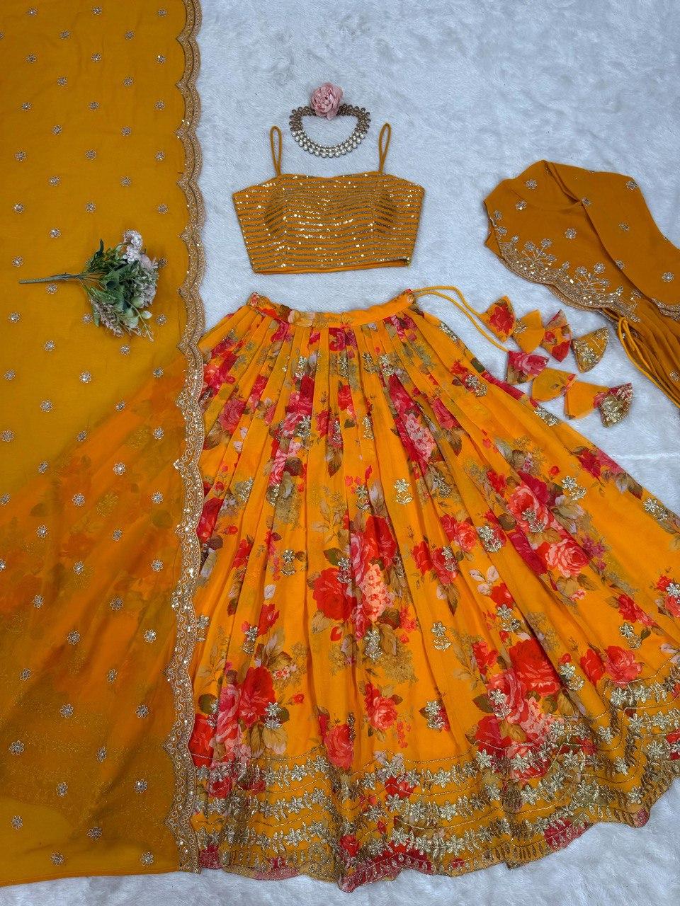 Mustard Yellow Floral Printed Lehenga Set