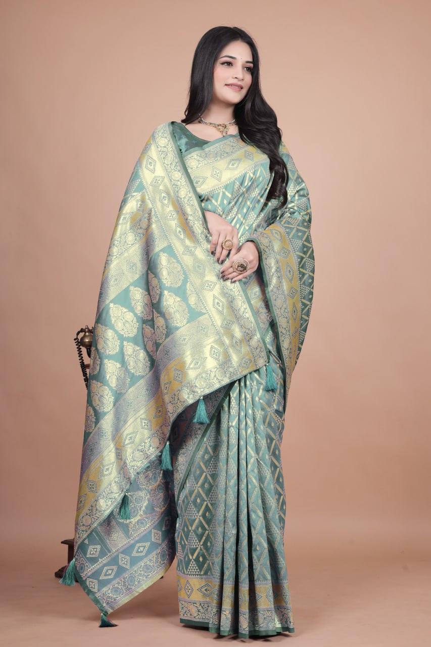 Elevate your ethnic wardrobe with this mesmerizing pastel green Banarasi silk saree, designed to exude timeless charm and modern elegance. This exquisite piece features intricate golden zari work with geometric diamond patterns across the body, beautifully contrasted by majestic floral motifs on the pallu and border.