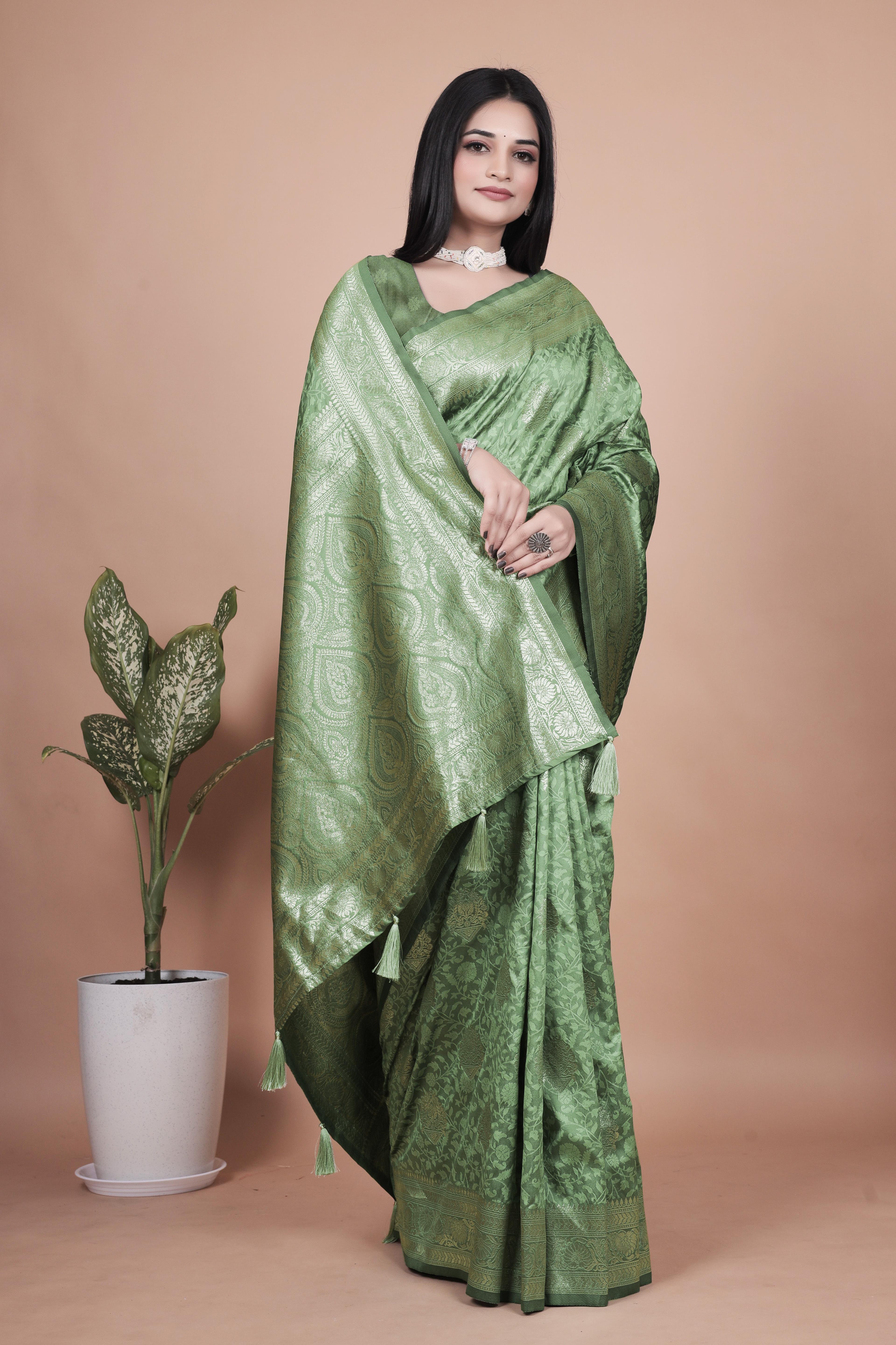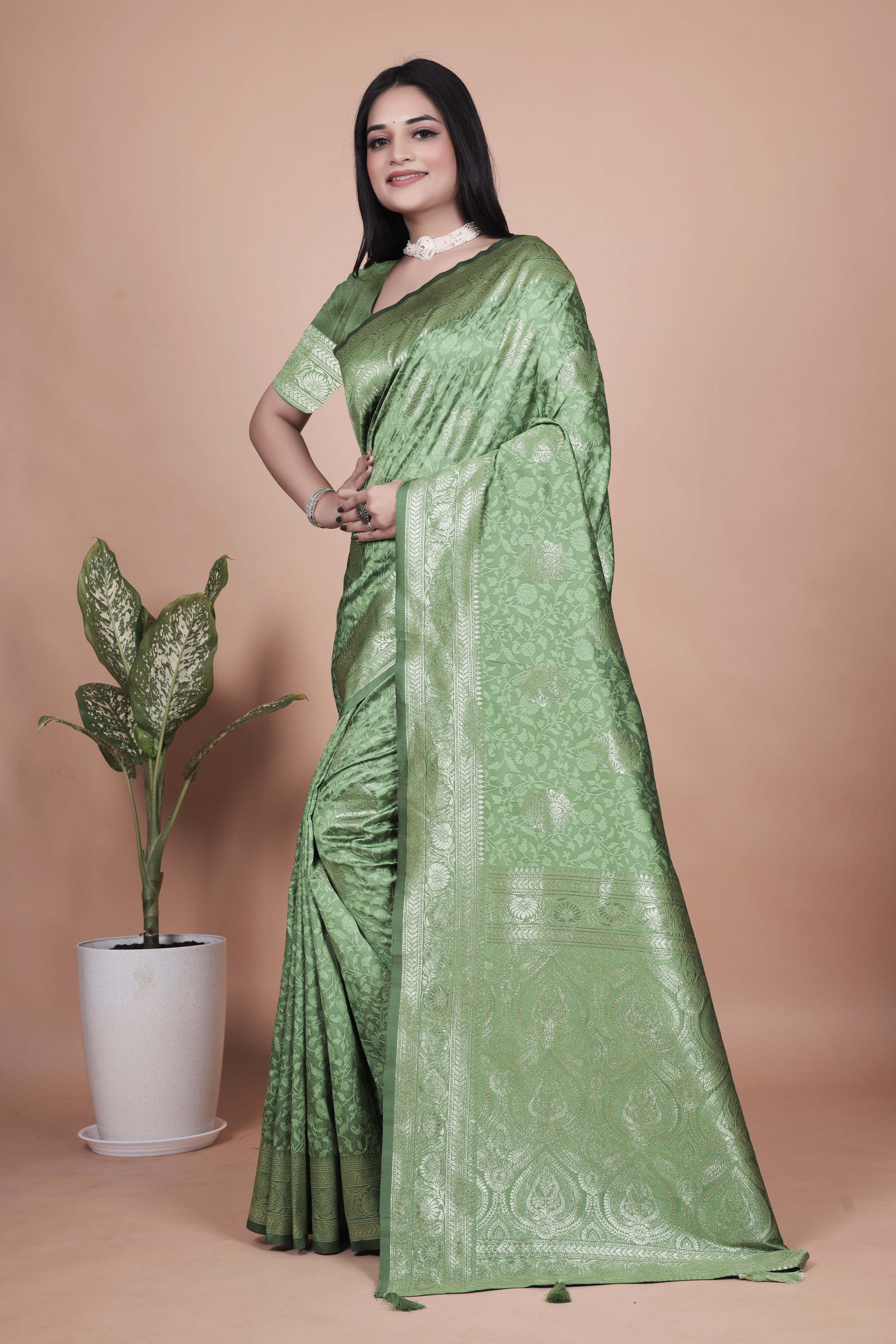 Bring timeless grace to your ethnic collection with this charming pista green Banarasi silk saree, beautifully woven with silver zari. The soothing green tone paired with lustrous detailing makes this saree a refined choice for traditional functions and festive celebrations. This saree is designed with all-over silver zari butti work, accentuated by a meticulously crafted border and an elegant pallu featuring floral and paisley Banarasi motifs. The rich silk fabric lends a luxurious drape, enhancing your look with poise and sophistication. Specifications: Color: Pista Green with Silver Zari Fabric: Banarasi Silk Work: Woven Silver Zari Butti with Rich Border & Pallu Pallu: Detailed with traditional Banarasi floral and paisley motifs Occasion: Perfect for Festivals, Ceremonies, Parties, and Traditional Events Saree Length: 5.5 meters | Blouse Piece: 0.8 meter (unstitched, in matching fabric) Care Instructions: Dry clean only. Store in a cool, dry place wrapped in muslin.