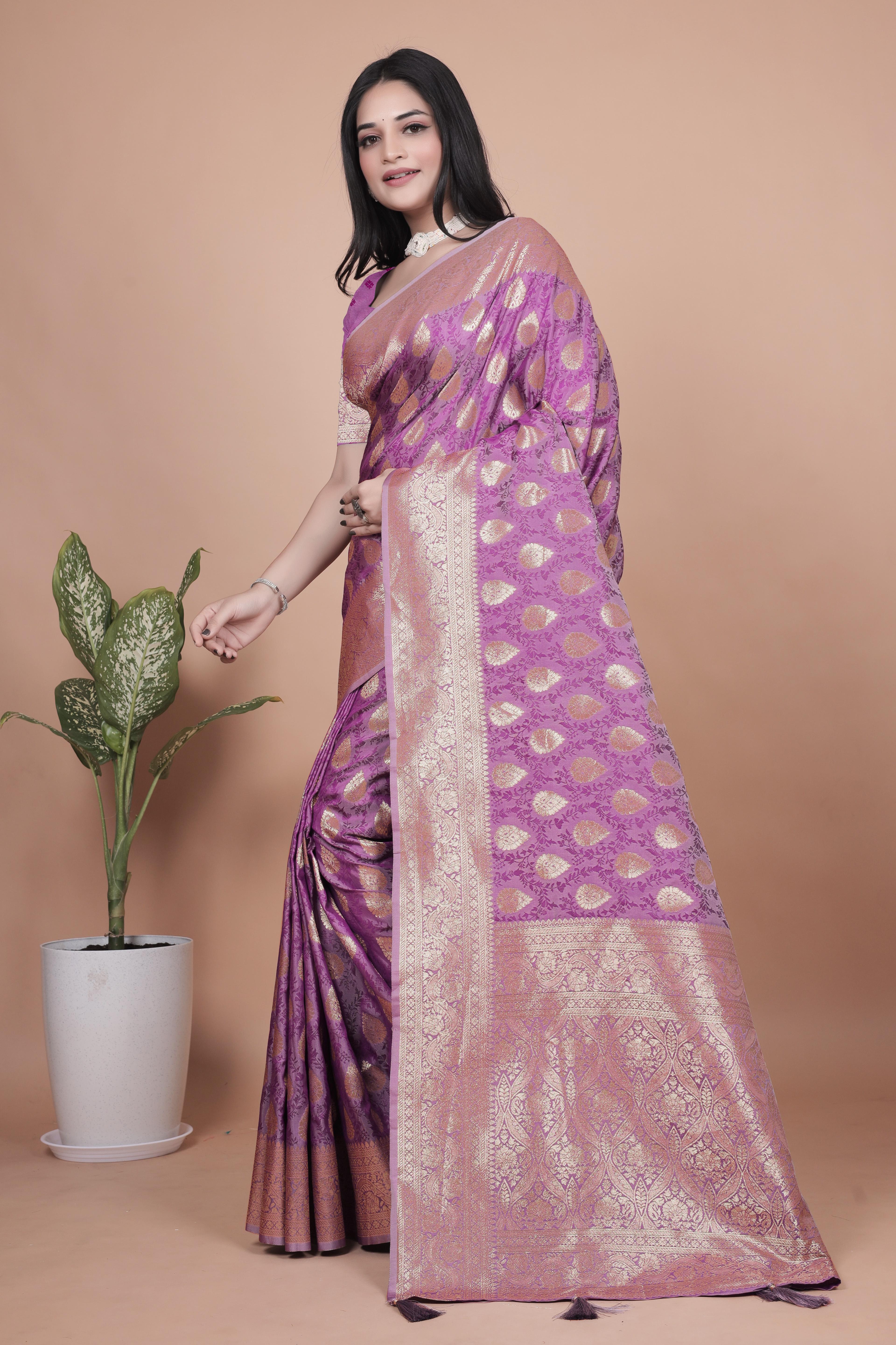 Exude grace and grandeur in this royal purple Banarasi silk saree, woven with gleaming golden zari motifs that shimmer with each step. Crafted with finesse, this saree is the epitome of traditional luxury, making it a must-have for festive events, weddings, and grand occasions. The saree’s body is adorned with elegant teardrop motifs enclosed in circular floral patterns, woven with precision to highlight the timeless artistry of Banarasi weaving. The grand pallu and richly bordered edges feature intricate detailing in gold zari, giving it a majestic look. The deep purple hue adds richness and depth to its opulence. Specifications: Color: Royal Purple with Golden Zari Fabric: Premium Banarasi Silk Work: Traditional woven zari motifs with decorative border Pallu: Luxurious gold zari pallu with detailed heritage motifs Occasion: Ideal for Weddings, Receptions, Festivals, and Ceremonies Saree Length: 5.5 meters | Blouse Piece: 0.8 meter unstitched Care Instructions: Dry clean only. Store in a muslin wrap to maintain its luster and texture.