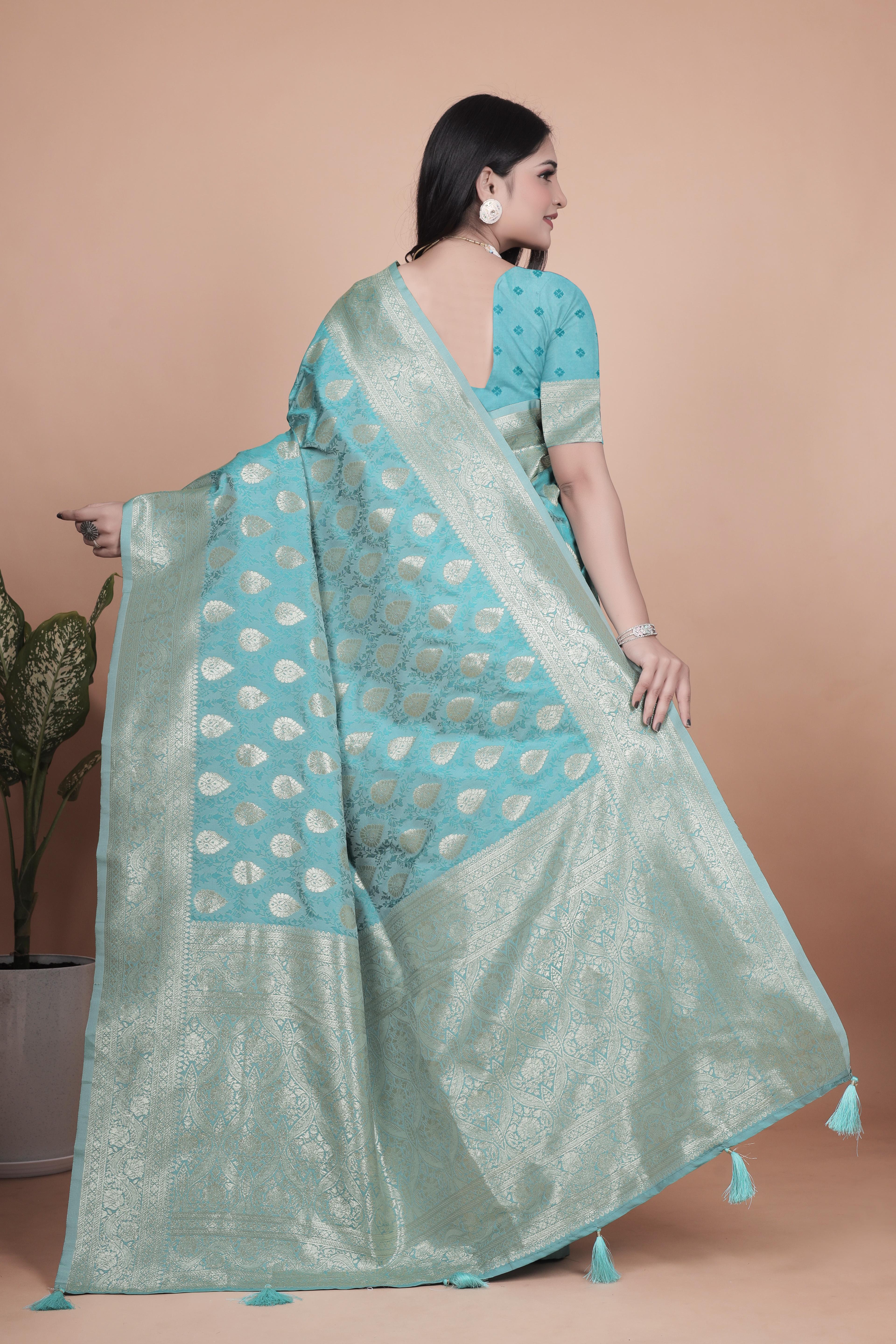 Refresh your ethnic wardrobe with this stunning sky blue Banarasi silk saree, exquisitely woven with shimmering silver zari. This piece reflects elegance and calm sophistication, ideal for both daytime celebrations and evening occasions. The saree features traditional butti motifs scattered all over, highlighted by a finely detailed silver zari border and a grand pallu adorned with floral and geometric Banarasi patterns. The soft silk fabric ensures graceful draping, while the cool blue tone makes it a flattering choice for all skin tones. Specifications: Color: Sky Blue with Silver Zari Fabric: Banarasi Silk Work: Woven Silver Zari Butti with Rich Border & Pallu Pallu: Detailed with traditional Banarasi motifs Occasion: Suitable for Festivals, Engagements, Parties, and Cultural Events Saree Length: 5.5 meters | Blouse Piece: 0.8 meter (unstitched, in matching fabric) Care Instructions: Dry clean only. Store in a cool, dry place wrapped in muslin